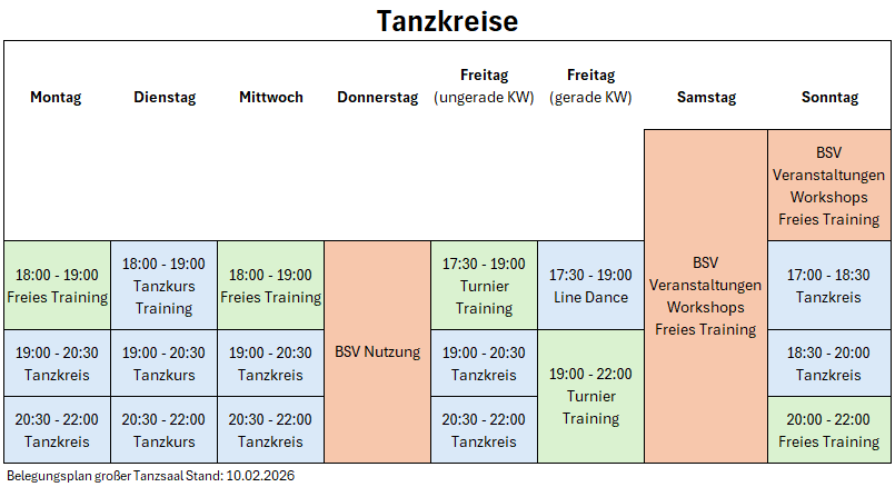 Neu ist unser Turniervorbereitungs-Tanzkreis für angehende Breitensport- und Turnierpaare. Seit 2024 sind wir als Tanzsportabteilung des BSV Kisdorf offizielles Mitglied im Deutschen Tanzsportverband DTV. Damit sind unsere Vereinspaare auch auf DTV-Amateur-Turnieren startberechtigt.